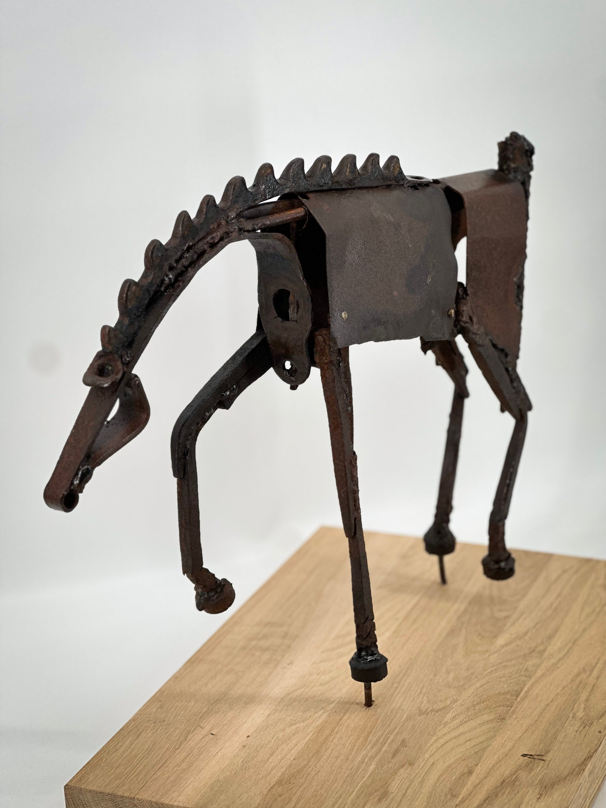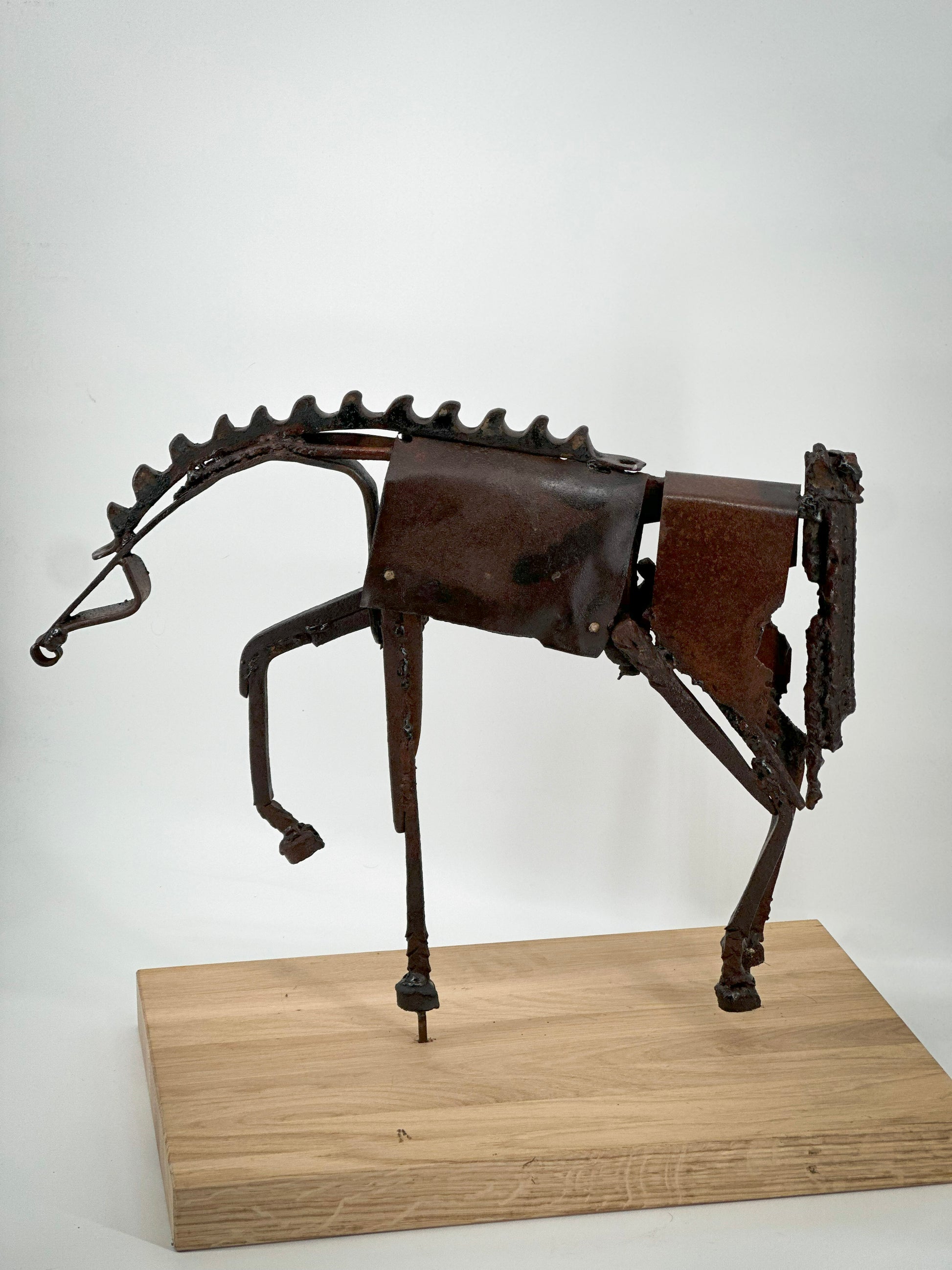rzeźba stalowa spawana, podstawa drewniana